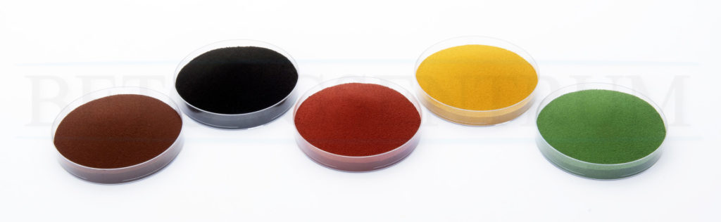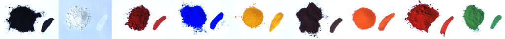 Fargene  Svart, Rød, Gul og Brun er Jernoxider, Grønn er kromiumoksid, Hvit er titanoksid og Blå er et syntetisk fargestoff (blå organisk koboltbasert kan skaffes på forespørsel).