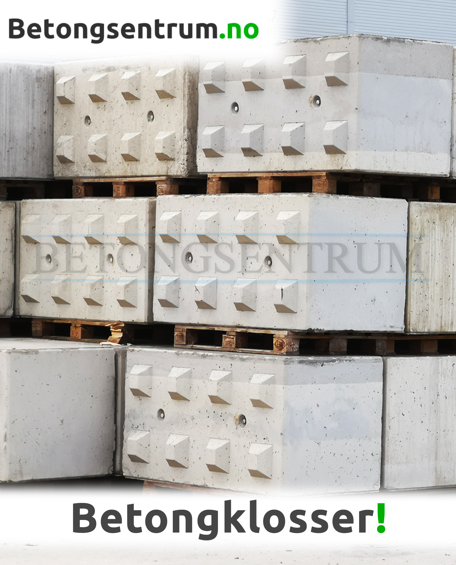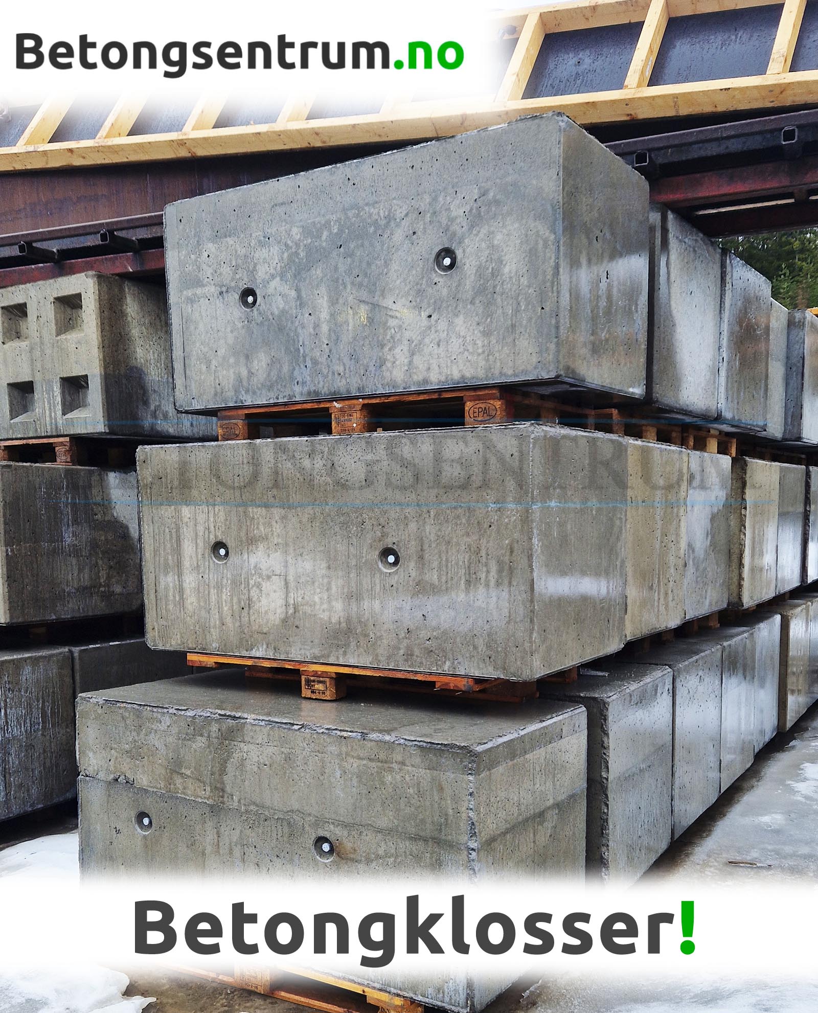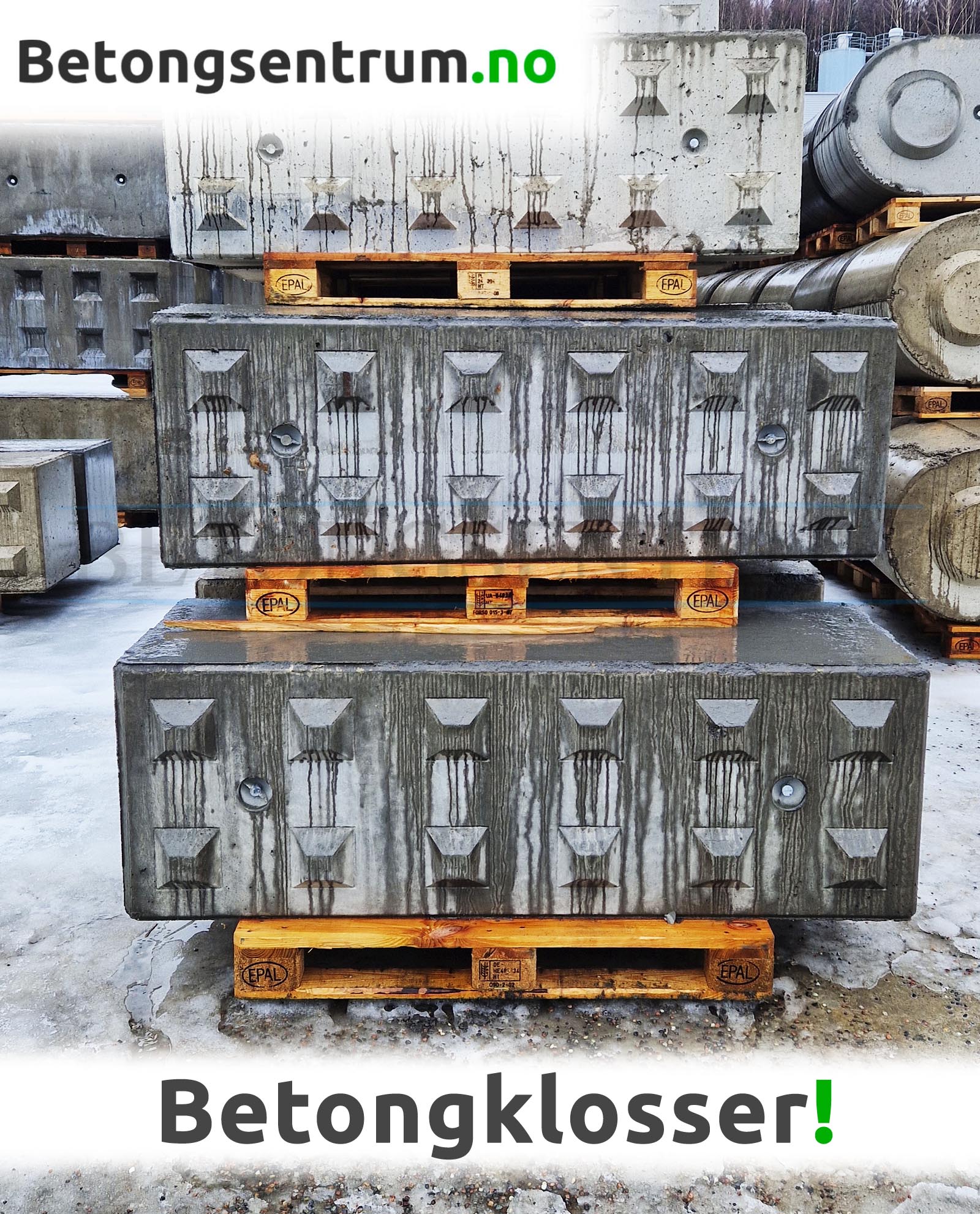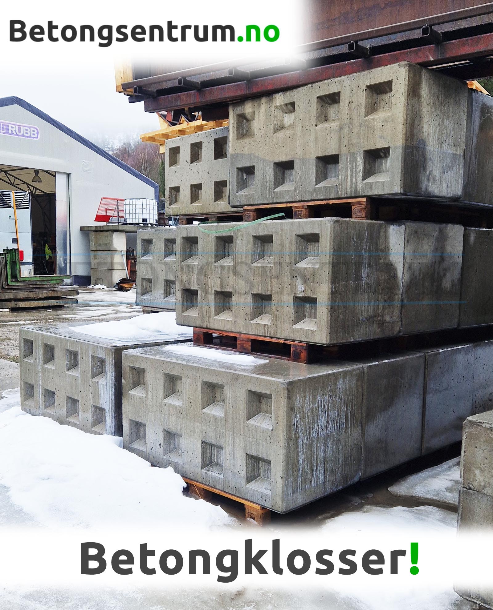Betongklosser kan stables i høyden og låses sammen som LEGO! De leveres i forskjellige størrelser og bredder, hvor de mest vanlige er 160x80x80cm (LxHxD) og 180x60x60cm. De kan også leveres som halvblokker, skråblokker og i andre spesialmål etter avtale.