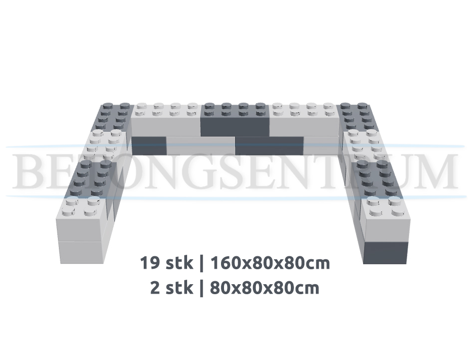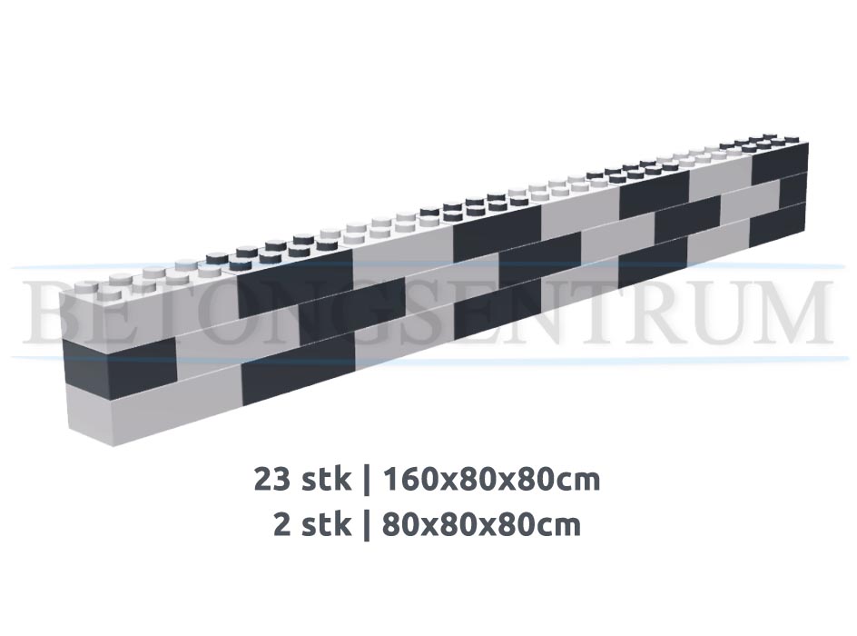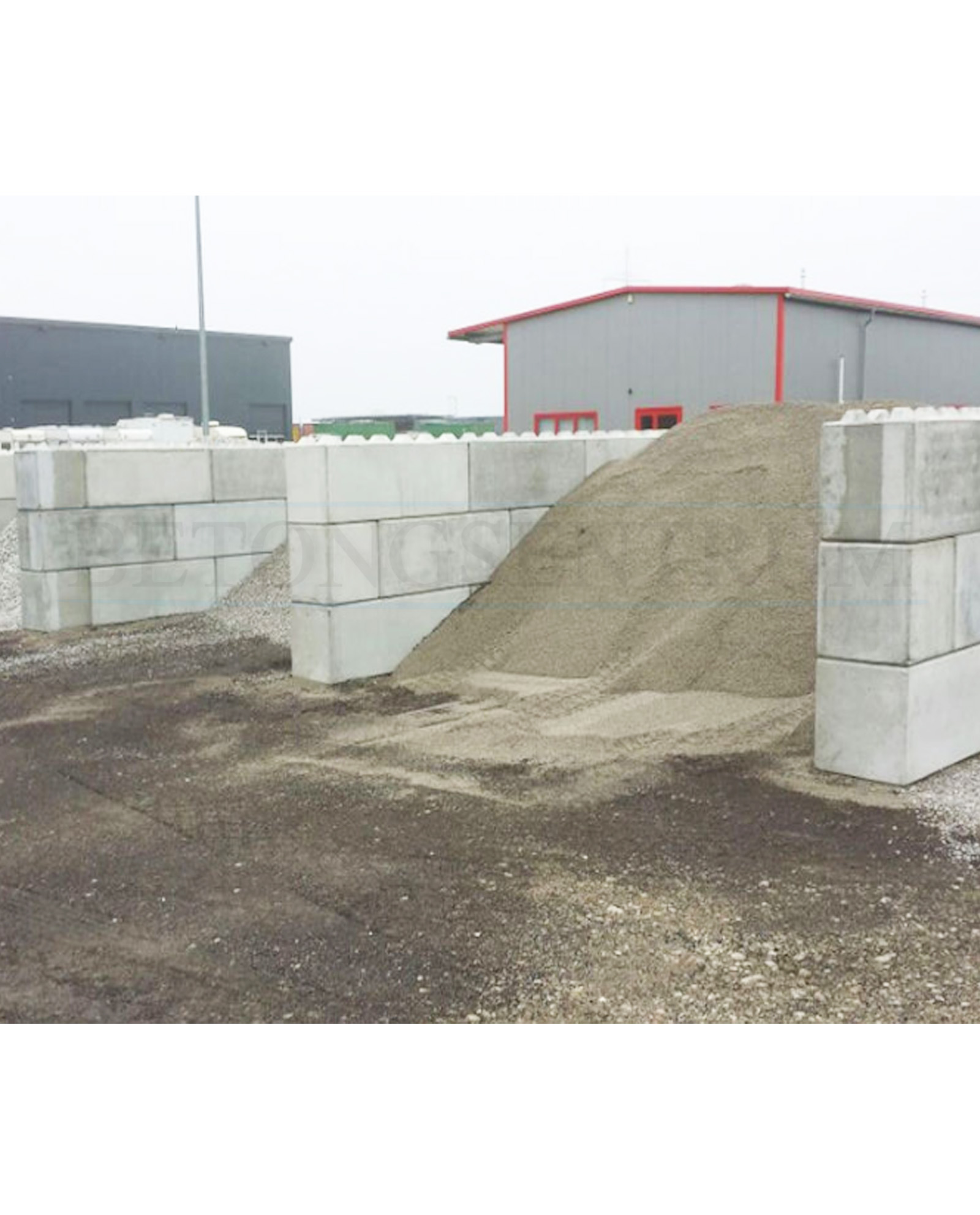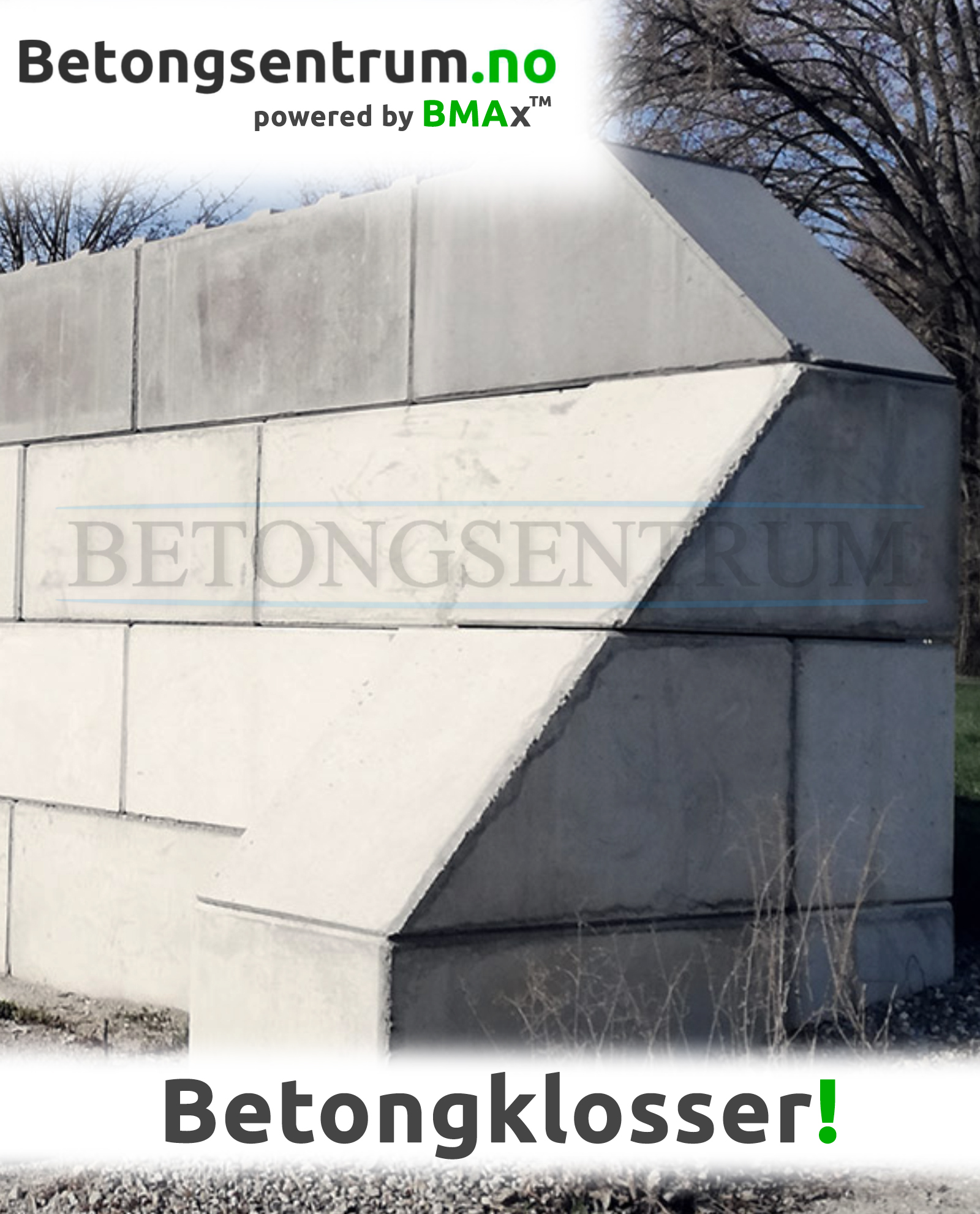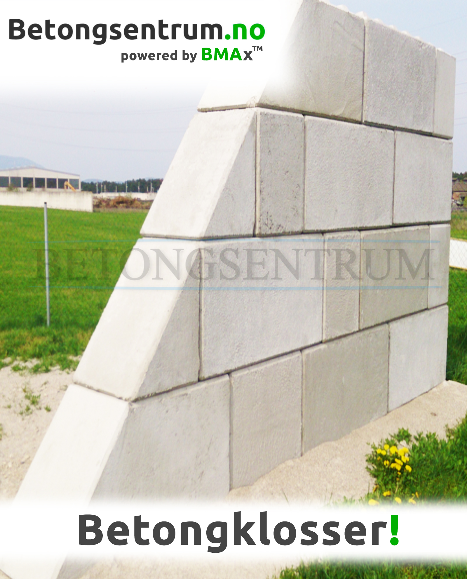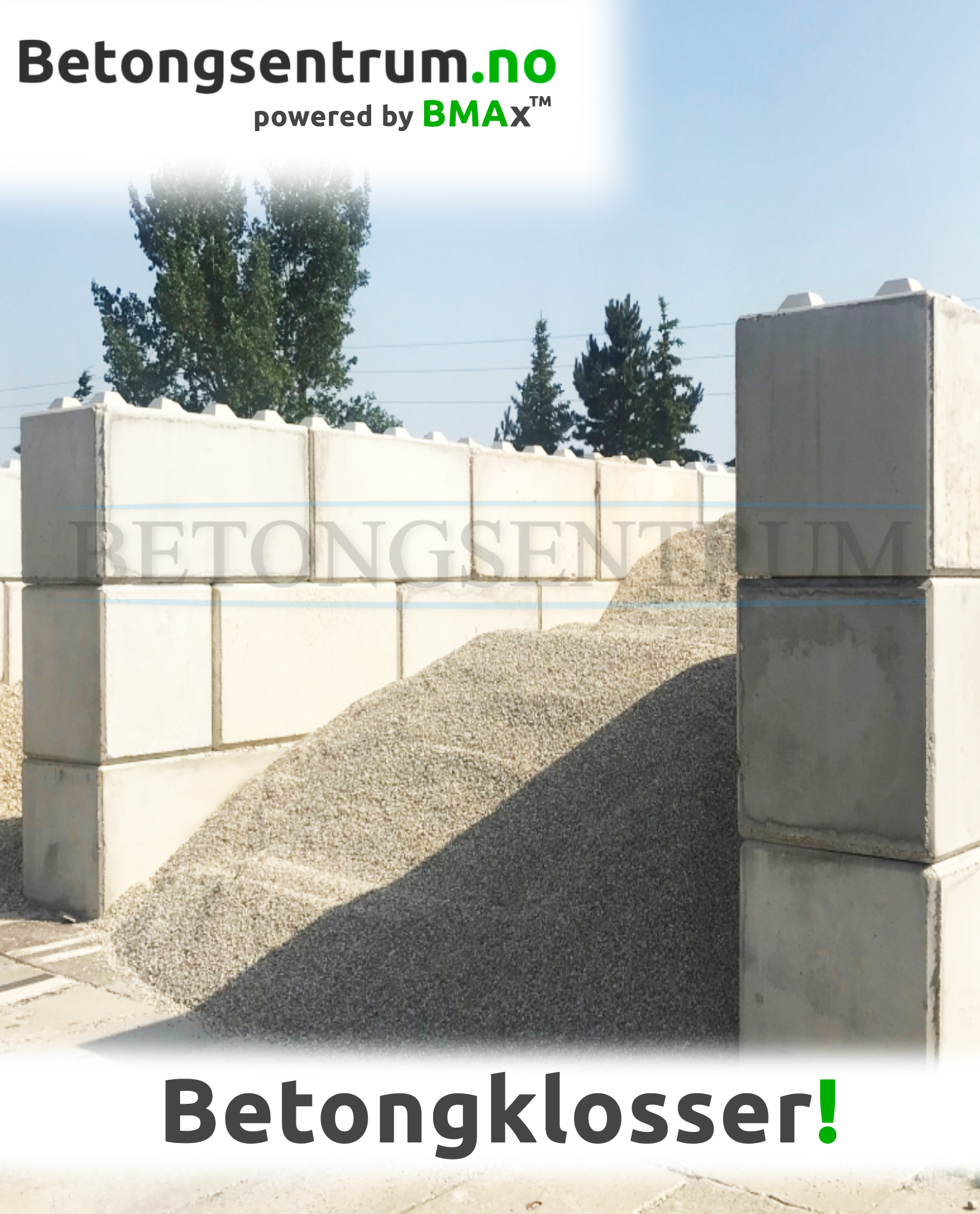 Betongklosser kan stables i høyden og låses sammen som LEGO! De leveres i forskjellige størrelser og bredder, hvor de mest vanlige er 160x80x80cm (LxHxD) og 180x60x60cm. De kan også leveres som halvblokker, skråblokker og i andre spesialmål etter avtale.