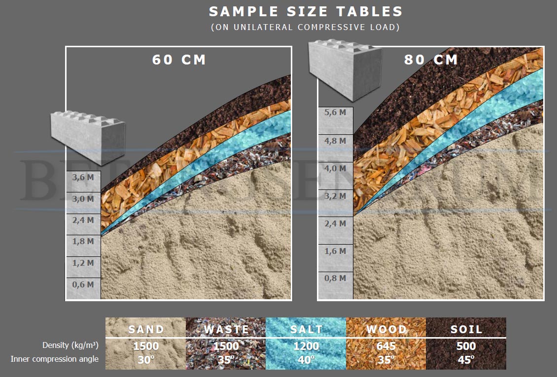 Standardblokk har målene 160 x 80 x 80 cm  med en vekt på 2400kg og kan leveres både med og uten innstøpte løfteankre.