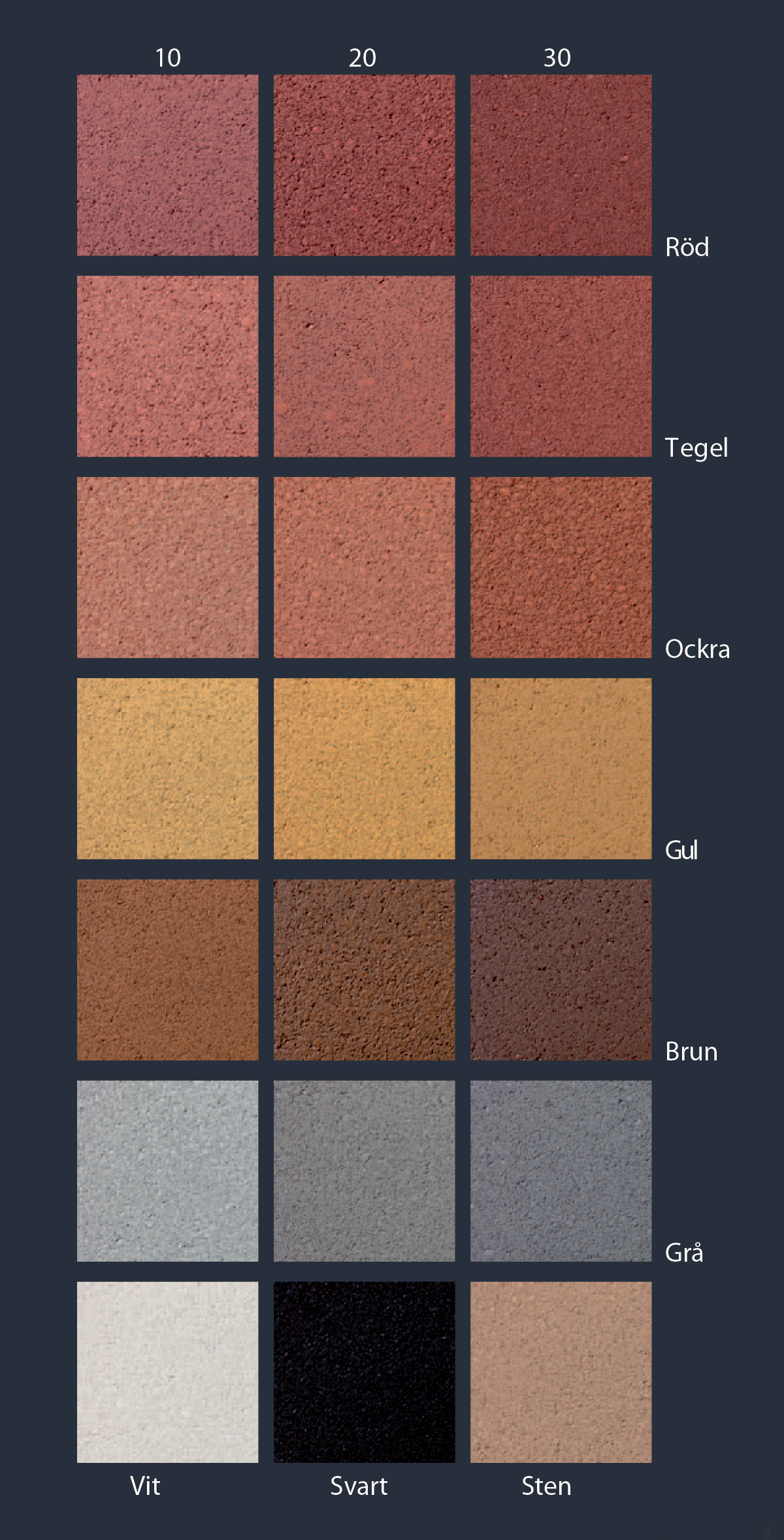 21 standard mineralfarger er tilgjengelig, i tillegg til 6 intense/pastell farger. Revello kan også leveres i alle andre RAL farger som spesialblanding (9l kanne).