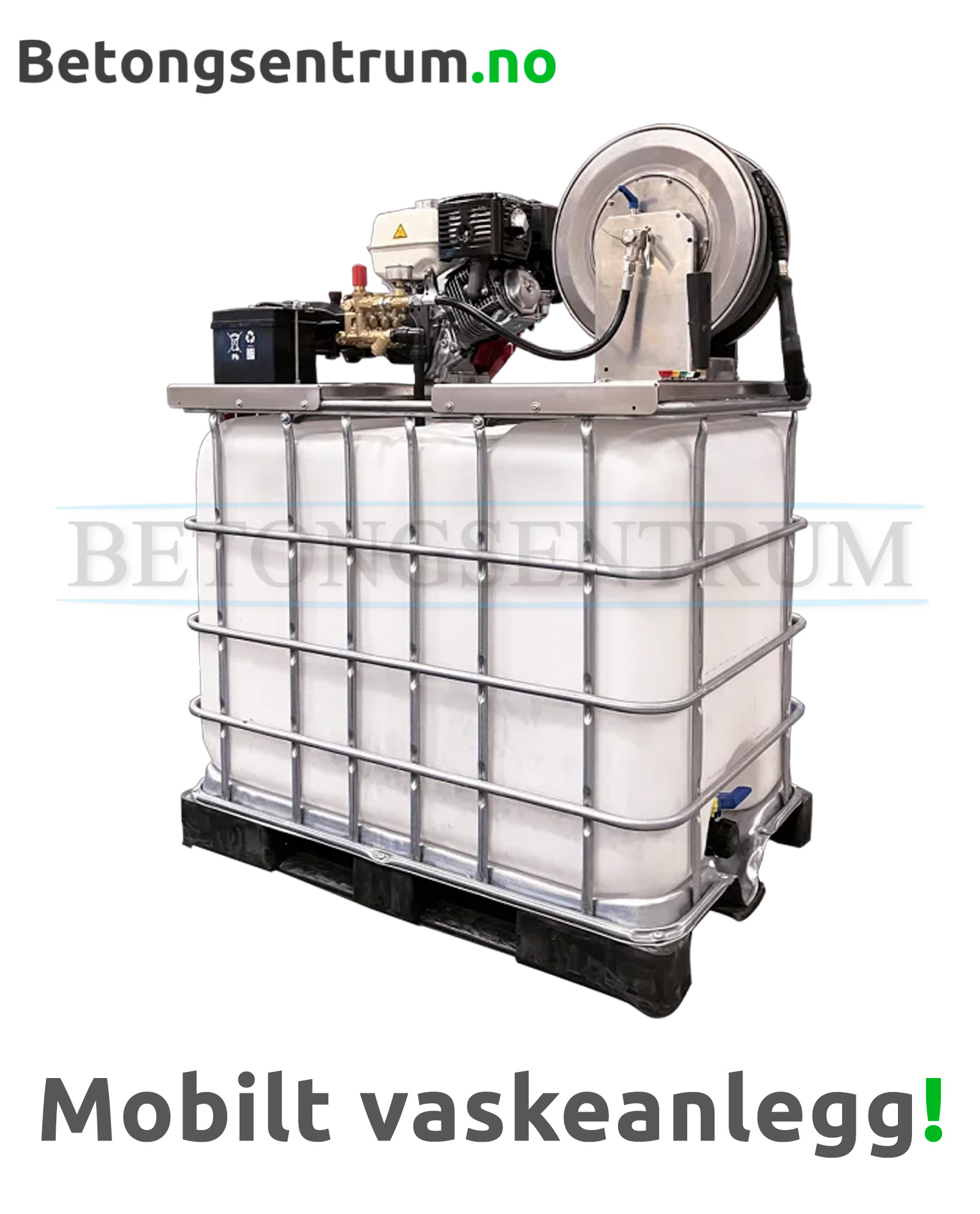 Mobil høytrykksvasker med Honda bensinmotor og 1000 liters vanntank, uten behov for tilkobling til strøm eller vann.