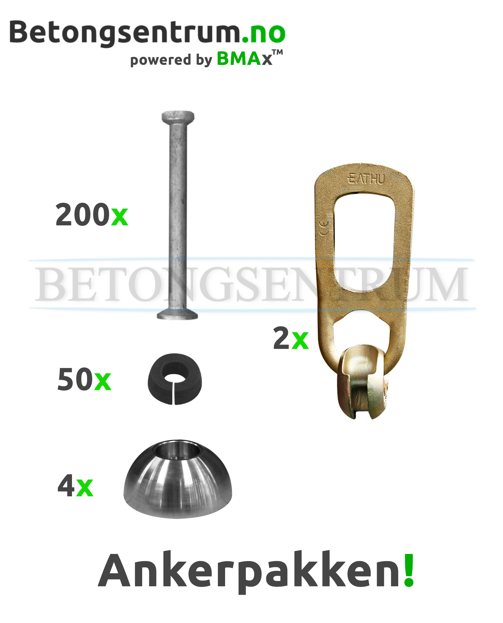 Pakken inneholder 200 stk anker, 50 stk mansjetter, 4 stk magneter og 2 stk løfteanker for tilkobling og løft.