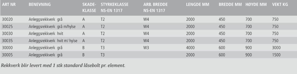 - Funksjon: Skal kunne stoppe lett til moderat trafikk ved påkjørsel, uten at rekkverket kollapser.