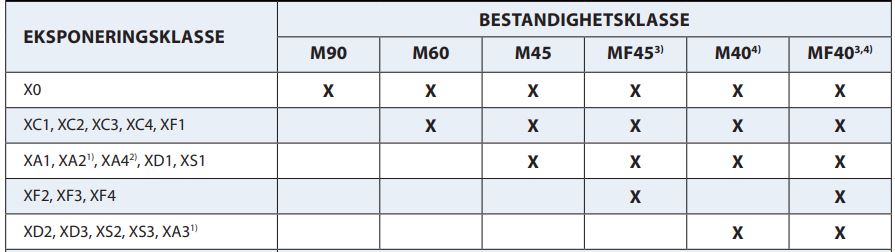 Tabellen viser aktuelle bestandighetsklasser i NS-EN 206 (2014).