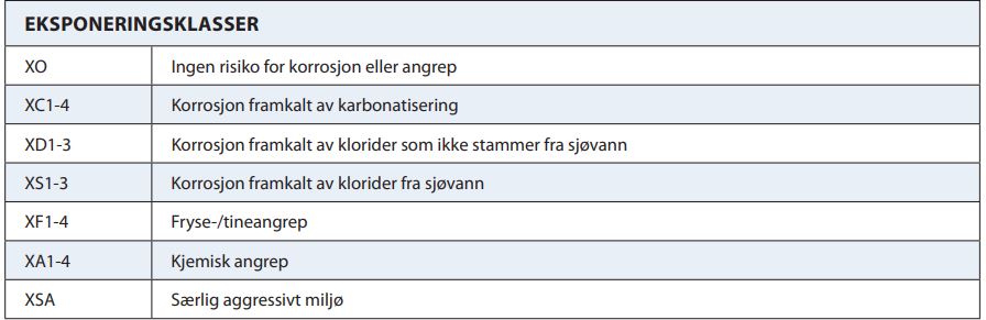 Tabellen viser aktuelle eksponeringsklasser i NS-EN 206 (2014).