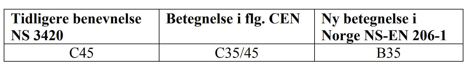 Tidligere var benevnelsen for fasthetsklassene blant annet C25, C35, C45, C55 (NS-3420 Kap. L).